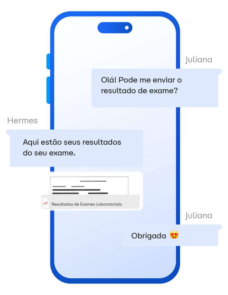 Seus pacientes poderão conferir resultados, informações de cadastro e muito mais de forma prática e sem complicação. Cada paciente tem acesso a resultados de exames, informações de cadastro e outros dados importantes em apps de comunicação que todos estão acostumados a usar.
